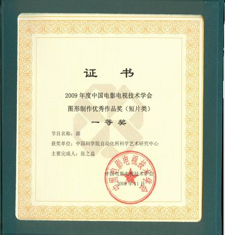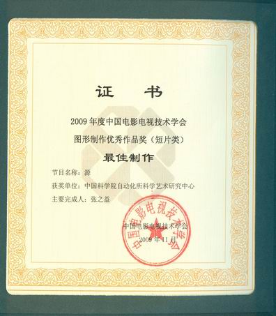 近日获悉,在中国电影电视技术学会组织的评选活动中,由自动化所制作的动画作品《源》荣获“2009年度中国电影电视技术学会图形制作优秀作品(短片类)最佳制作奖”及“2009年度中国电影电视技术学会图形制作优秀作品(短片类)一等奖”两项大奖,这是继获第二届中国数字出版博览会“数字出版优秀作品奖”后再次获得殊荣。